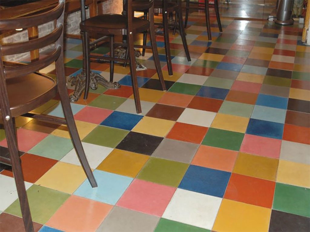 - tato dlažba se vyrábí za studena vyléváním základu do forem, poté se vlévají do jednotlivých políček formy (vzoru) namíchané barvy, tato probarvená vrstva je vysoká cca 3-4 mm, nemusíte se tedy bát poškození dekoru nebo otěru barvy