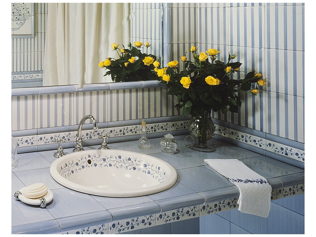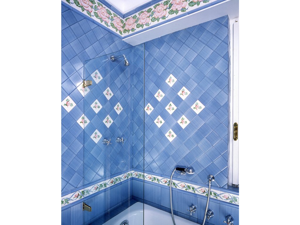 Modrá koupelna v kombinaci s dekorovanými obklady.