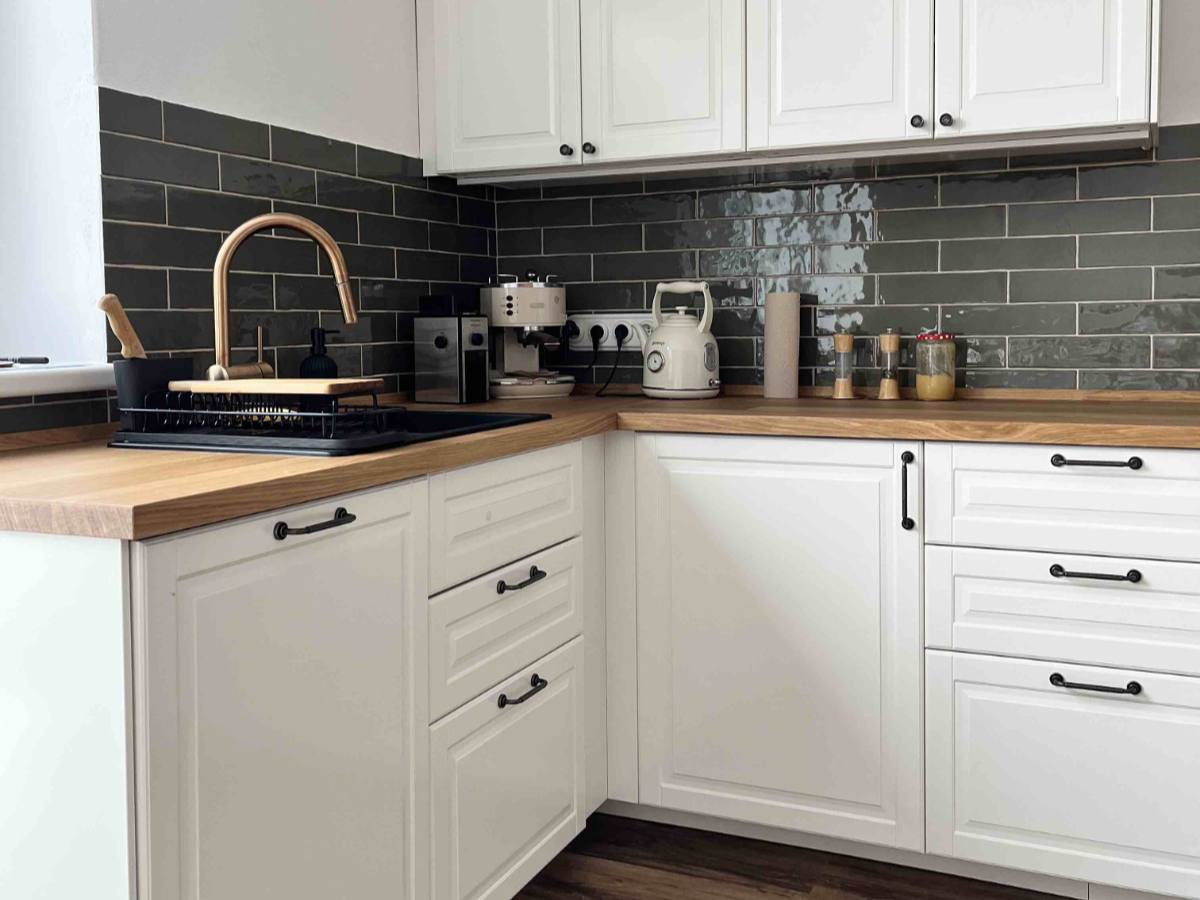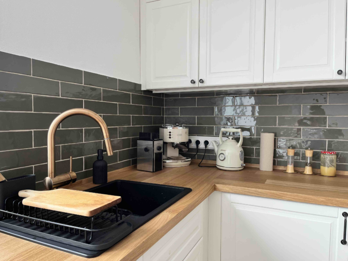 V kombinaci s dřevěnou pracovní deskou a bílými dvířky vzniká prostředí, které nepůsobí jako „hotový návrh“, ale jako místo, kde se zkrátka žije.