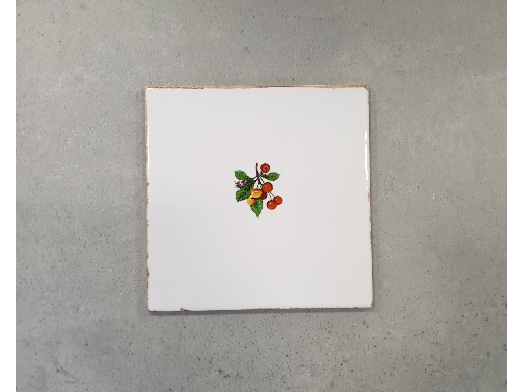 Bílý, lesklý obklad Forli, vhodný na stěny interiéru. Je zdoben třešněmi uprostřed.