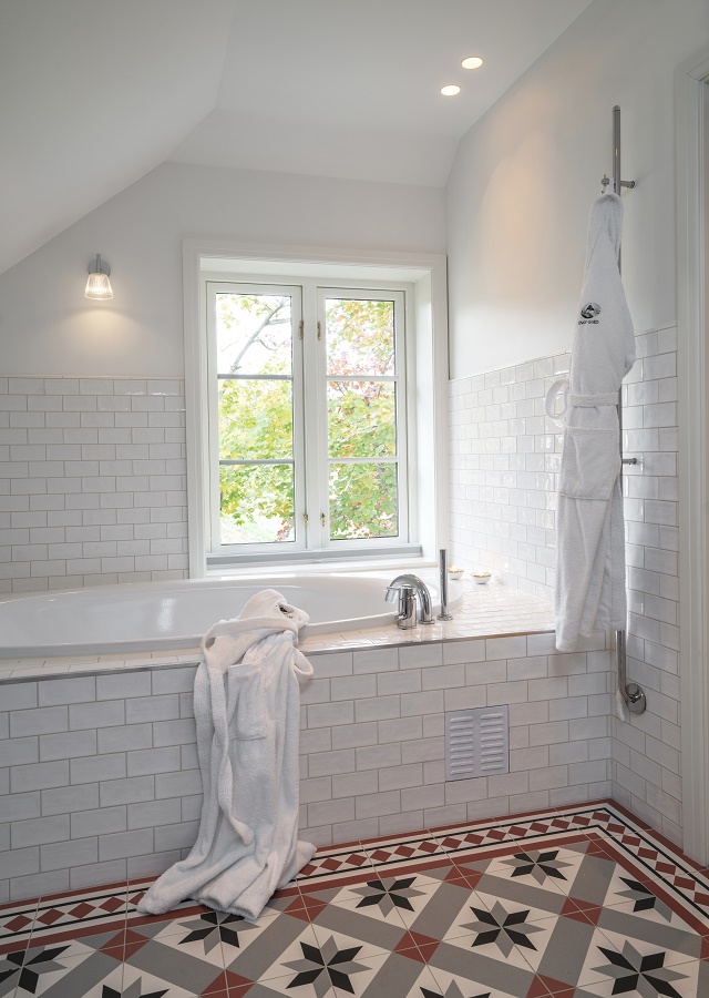 Vzorované dlaždice 20x20 na podlaze v koupelně maji nejen estetickou, ale i protiskluznou funkci.
