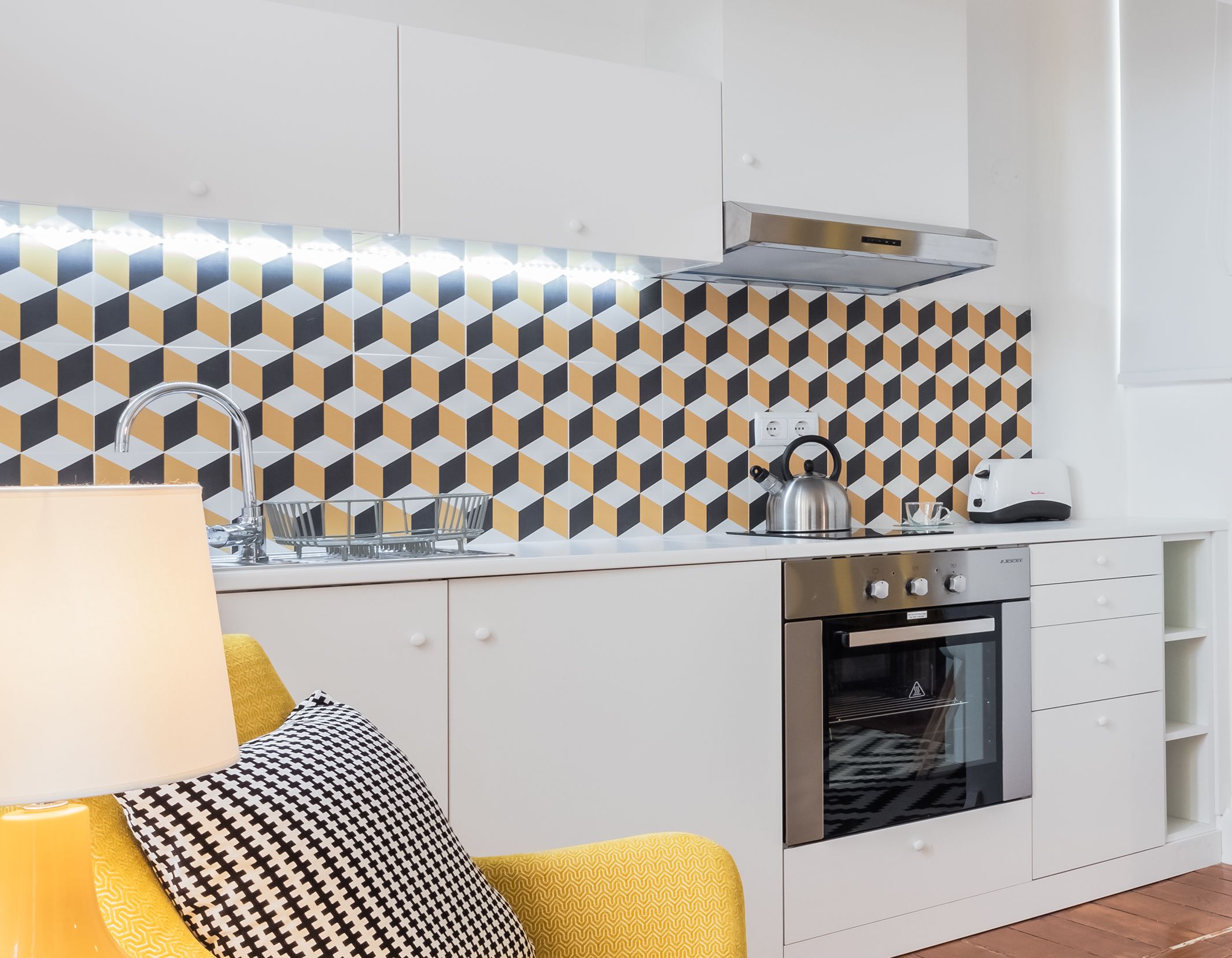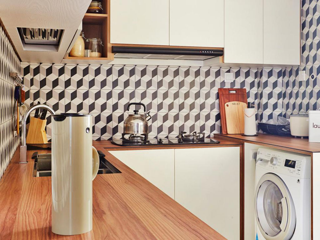 Dekorované dlaždice 20x20 za kuchyňskou linkou podtrhnou minimalistický styl.