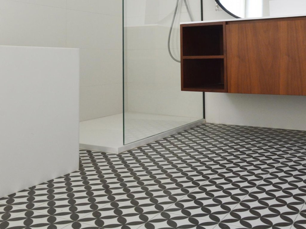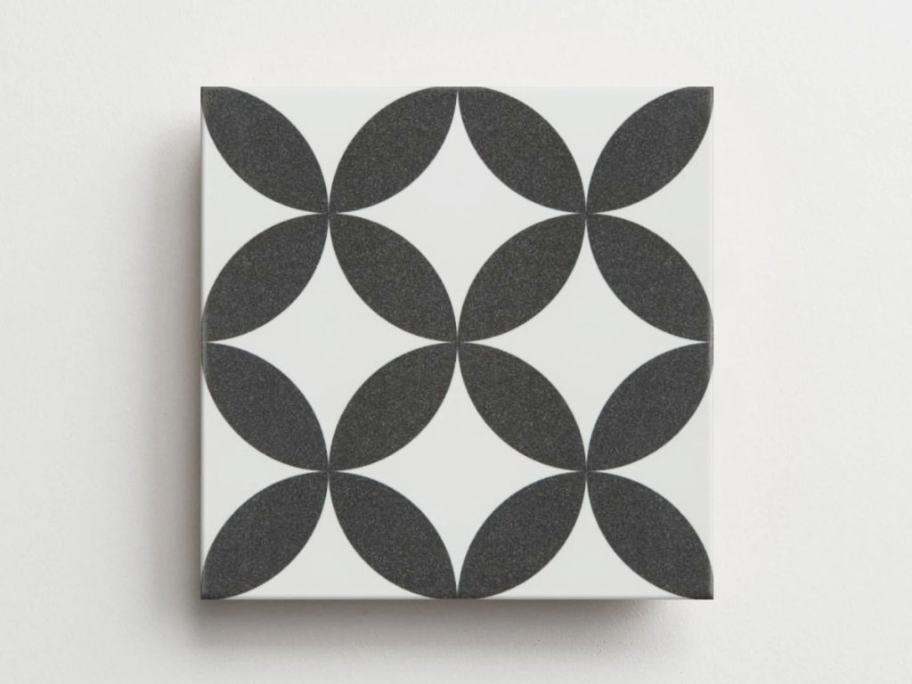 Geometrická čtvercová dlaždice Revoir Paris La Madeleine Gilles Noir ve formátu 20×20 cm s matným povrchem. Na světlém (white/ivory) podkladu se skládají antracitově černé „čočky/okvětní lístky“ do pravidelného kruhového rastru – na ploše vzniká moderní, rytmická kobercová kresba s historickým nádechem. Výborně se kombinuje s jednobarevnými prvky kolekce La Madeleine (ivory, grey, black).