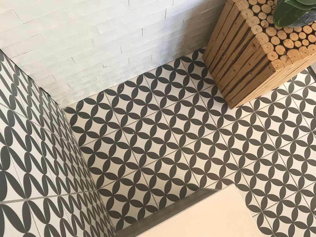 - Pro ostrý kontrast zvolte spárovačku v tónu ivory či světlá šedá (šířka 2–3 mm).