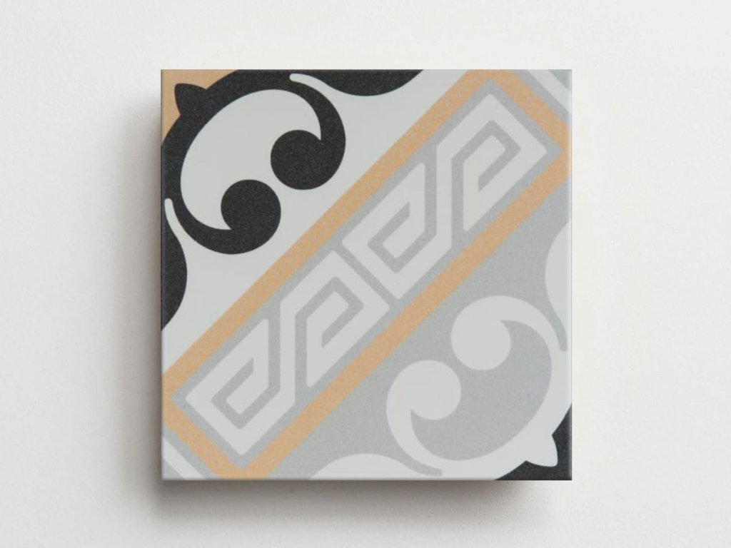 Vzorovaná čtvercová dlaždice Revoir Paris La Madeleine Juliette Marron ve formátu 20×20 cm s matným povrchem. Diagonálu tvoří pás s motivem řeckého klíče v odstínech světlé a střední šedé, lemovaný teplou pískově-marron linkou. Po stranách jej doplňují kontrastní černo-šedé voluty na světlém podkladu. Na ploše vzniká výrazná, ale kultivovaná kobercová kresba vhodná do vstupních prostor, kuchyní i koupelen. Snadno ji zkombinujete s jednobarevnými kusy série La Madeleine (ivory/grey/marron/black).