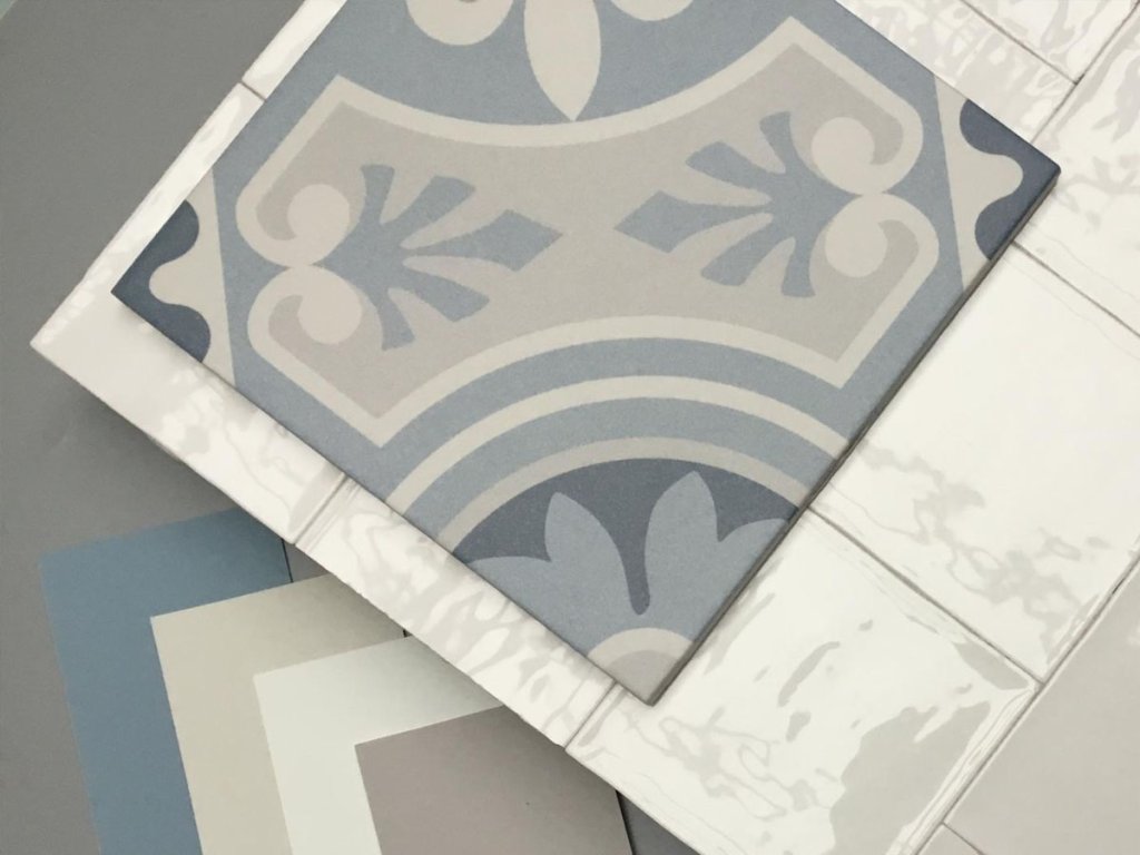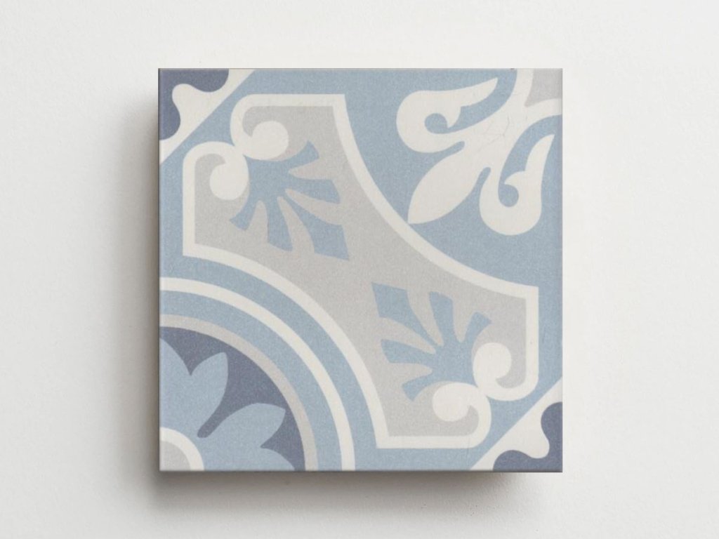 Vzorovaná čtvercová dlaždice Revoir Paris La Madeleine Lilou Ocean ve formátu 20×20 cm s matným povrchem. Klasický florální ornament v kombinaci oceánsky a soft blue s světle šedými plochami a ivory konturami působí svěže a nadčasově. Na ploše vytváří elegantní kobercovou skladbu pro kuchyně, vstupy i koupelny. Snadno sladíte s jednobarevnými dlaždicemi série (ivory/grey/soft blue).