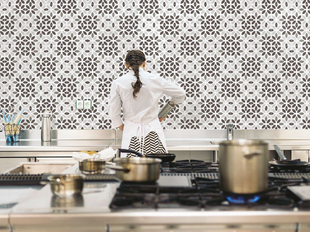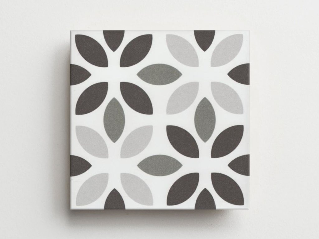 Vzorovaná čtvercová dlaždice Revoir Paris La Madeleine Lyla Noir ve formátu 20×20 cm s matným povrchem. Minimalistický motiv tvoří opakující se „lístky“ v odstínech černé a šedé na bílém podkladu, které se na ploše skládají do moderní květinové mřížky. Nadčasová černo-šedá paleta se hodí do kuchyní, vstupů i koupelen a krásně se páruje s jednobarevnými kusy série (ivory/grey/black).
