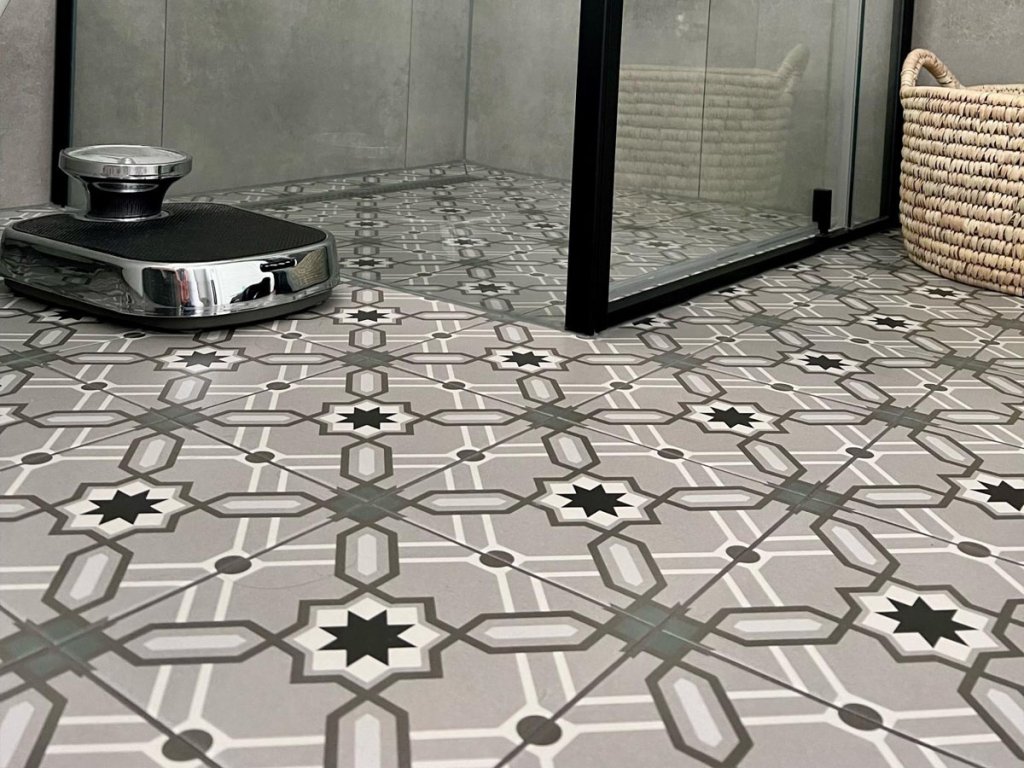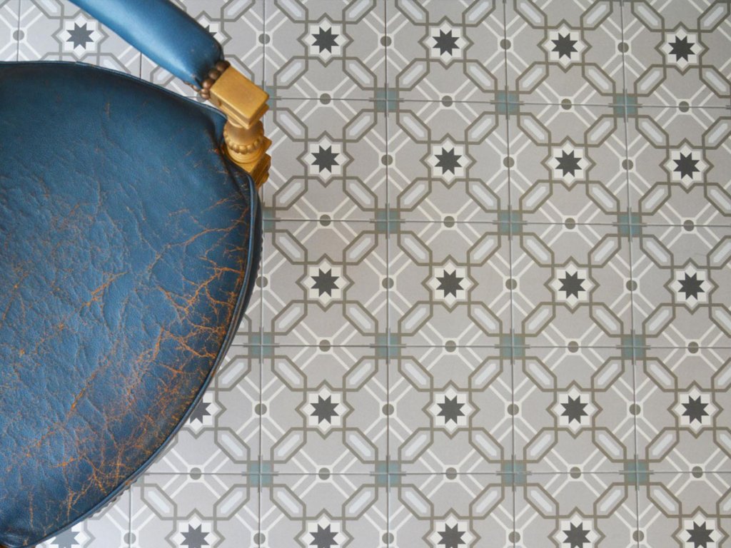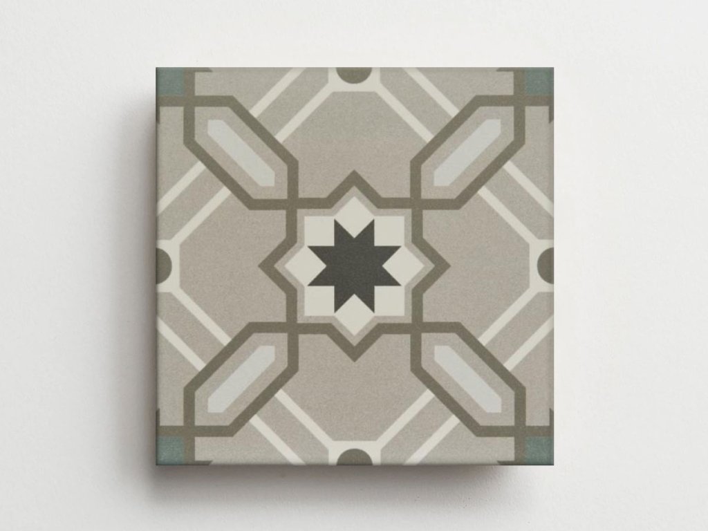 Vzorovaná čtvercová dlaždice Revoir Paris La Madeleine Odie ve formátu 20×20 cm s matným povrchem. Na greige/taupe podkladu se odvíjí rámová geometrie v tónech taupe a ivory se středovou antracitovou hvězdicí; rohy a detaily zvýrazňuje decentní olivovo-šedý akcent. Na ploše vzniká vyvážená, nadčasová kobercová kresba pro chodby, kuchyně i koupelny. Skvěle se kombinuje s jednobarevnými kusy série (ivory/grey/taupe/olive).