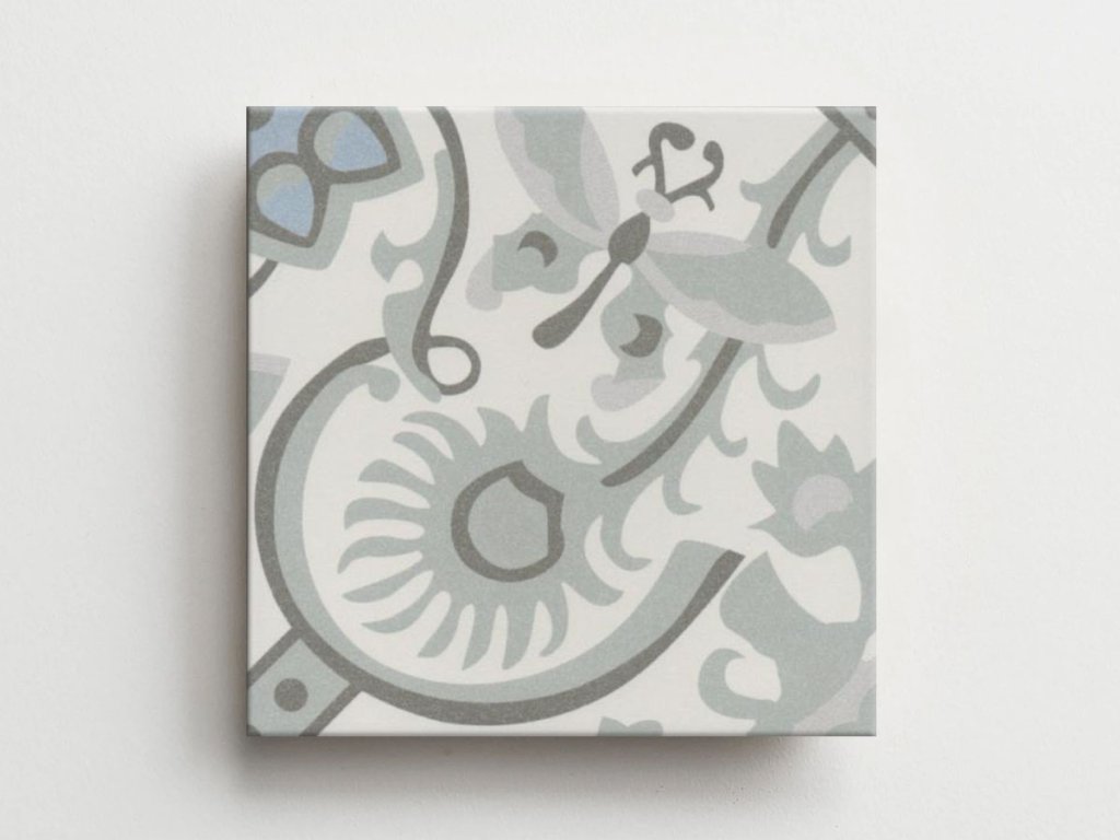Vzorovaná čtvercová dlaždice Revoir Paris La Madeleine Papillon ve formátu 20×20 cm s matným povrchem. Na světlém (ivory) podkladu se jemně vine motýlí a florální arabeska v tónech šedé a sage/sea-green se subtilním soft-blue detailem v rozích. Na ploše vytváří delikátní, romantickou kobercovou skladbu pro koupelny, kuchyně i vstupní haly. Skvěle ladí s jednobarevnými variantami série (ivory/grey/sage/soft blue).