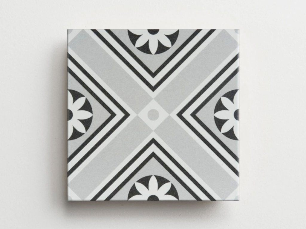 Vzorovaná čtvercová dlaždice Revoir Paris La Madeleine Rosalie ve formátu 20×20 cm s matným povrchem. Dominantní diagonální „X“ v pruzích světle a tmavě šedé s černým linkováním rámuje střed s jemným puntíkem; rohy vyplňují bílé květinové čtvrtkruhy. Vzniká elegantní, rytmická kobercová skladba vhodná do kuchyní, vstupů i koupelen. Snadno sladíte s jednobarevnými kusy série (ivory/grey/charcoal).