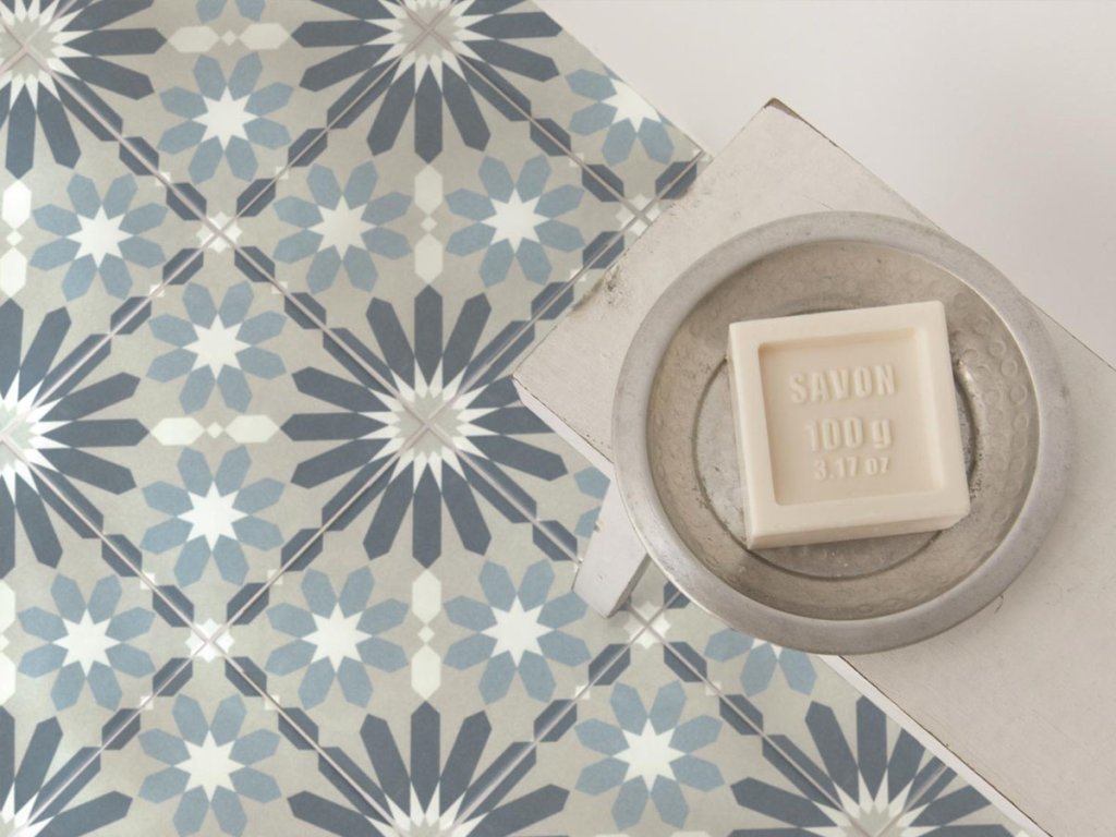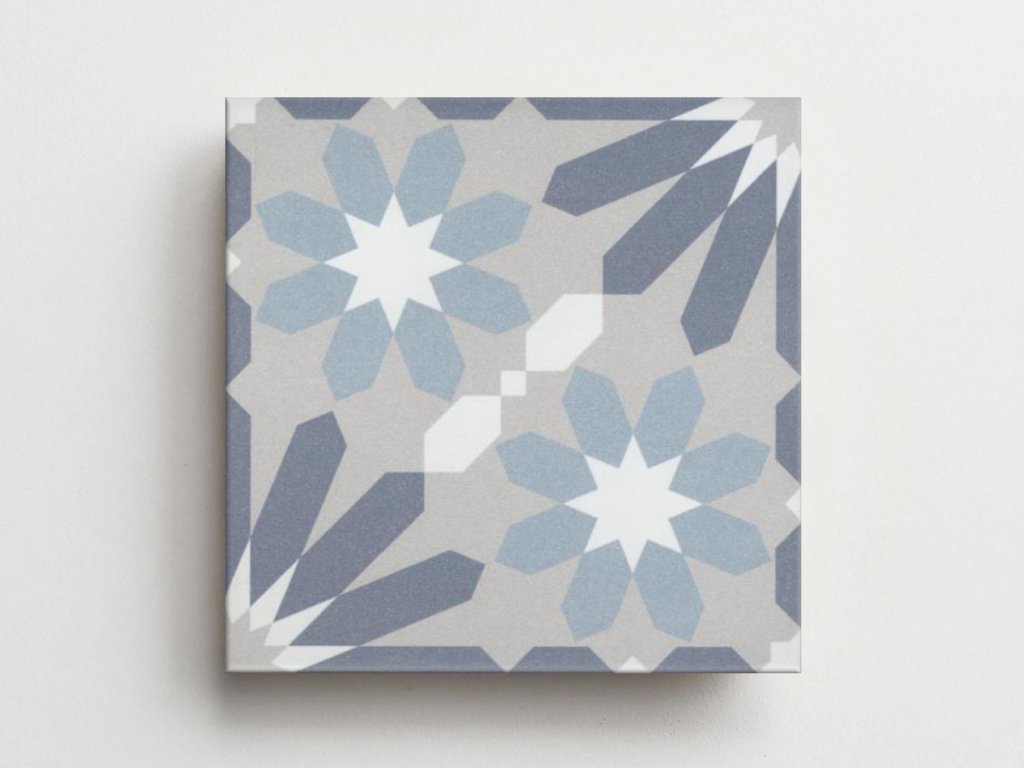 Vzorovaná čtvercová dlaždice Revoir Paris La Madeleine Syrah Bleu ve formátu 20×20 cm s matným povrchem. Na světle šedém podkladu se rytmicky střídají hvězdicové rozety v tónech light/dusty blue a šedé, orámované paprsky v diagonálách. Na ploše vytváří jemnou, ale výraznou kobercovou skladbu – skvělou do kuchyní, chodeb i koupelen. Snadno se páruje s jednobarevnými kusy série (ivory/grey/soft blue).