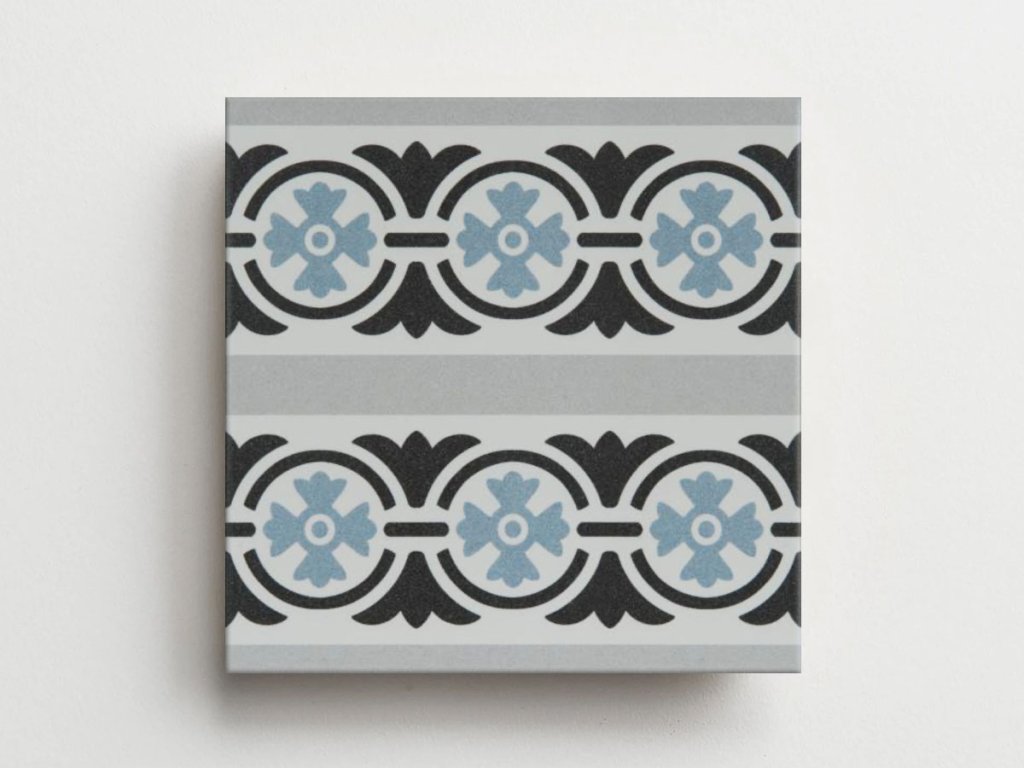 Rovná bordura Touquet Ligne ve formátu 20×20 cm s matným povrchem. Dvojitý pás s rozetkami v modré doplňuje šedá a černá. Určeno k rámování kobercových skladeb nebo jako dekorativní pruh podél stěn a podlah. Barevně ladí s dekory série La Madeleine.