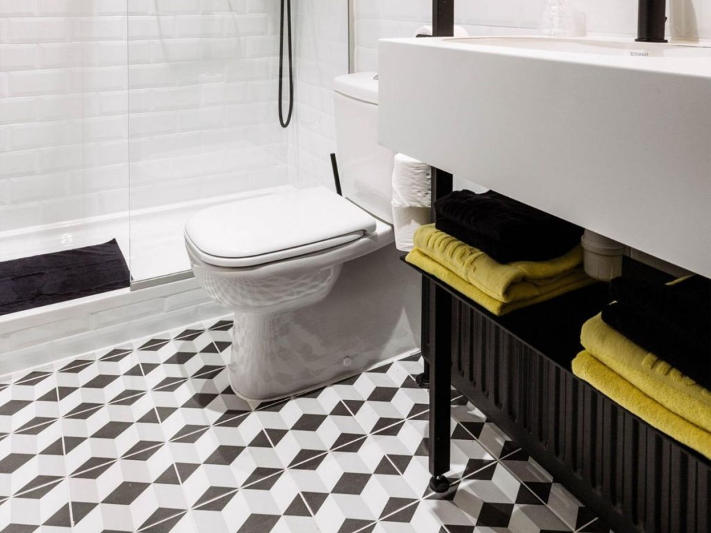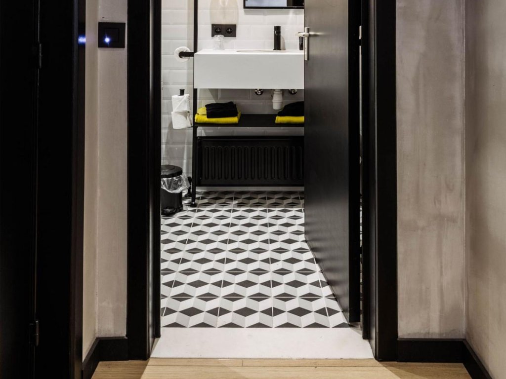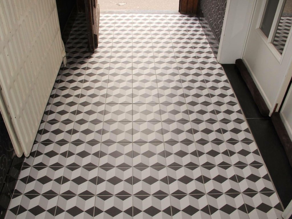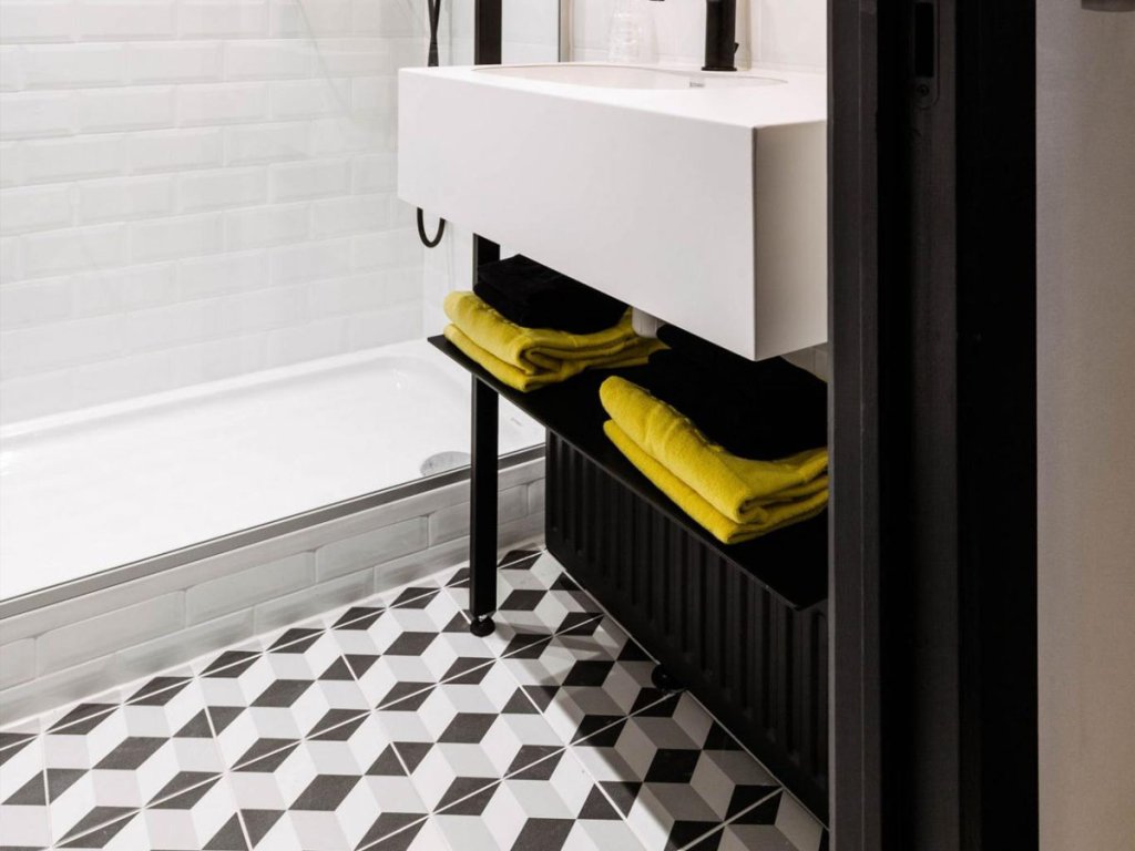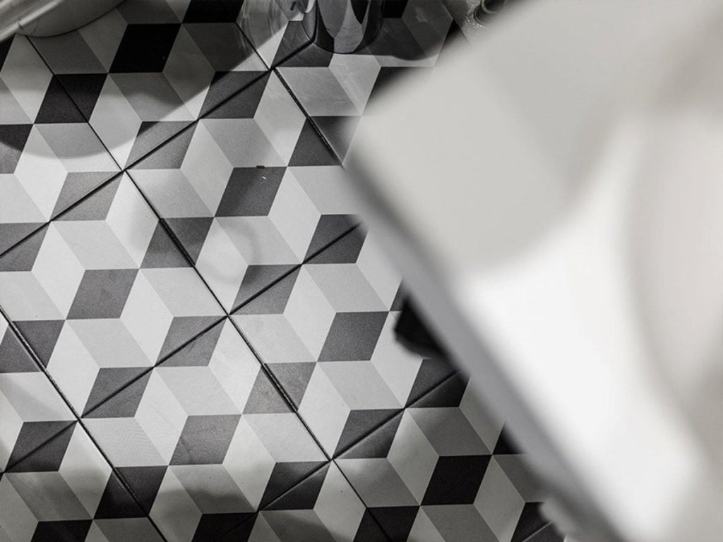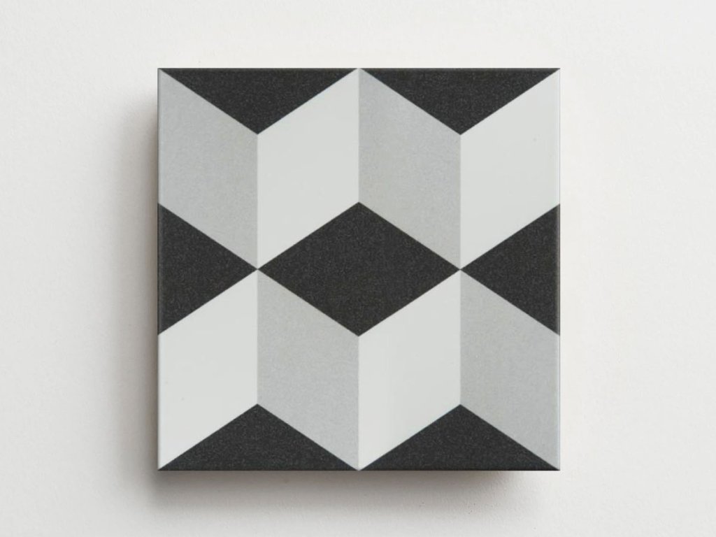 Vzorovaná čtvercová dlaždice Revoir Paris La Madeleine Victor ve formátu 20×20 cm s matným povrchem. Optická 3D „kostková“ kresba vzniká střídáním bílé, světle šedé a antracitové. Vzniká výrazný, ale nadčasový grafický koberec do kuchyní, chodeb, vstupů i kaváren. Skvěle ladí s jednobarevnými kusy série (ivory/grey/charcoal).