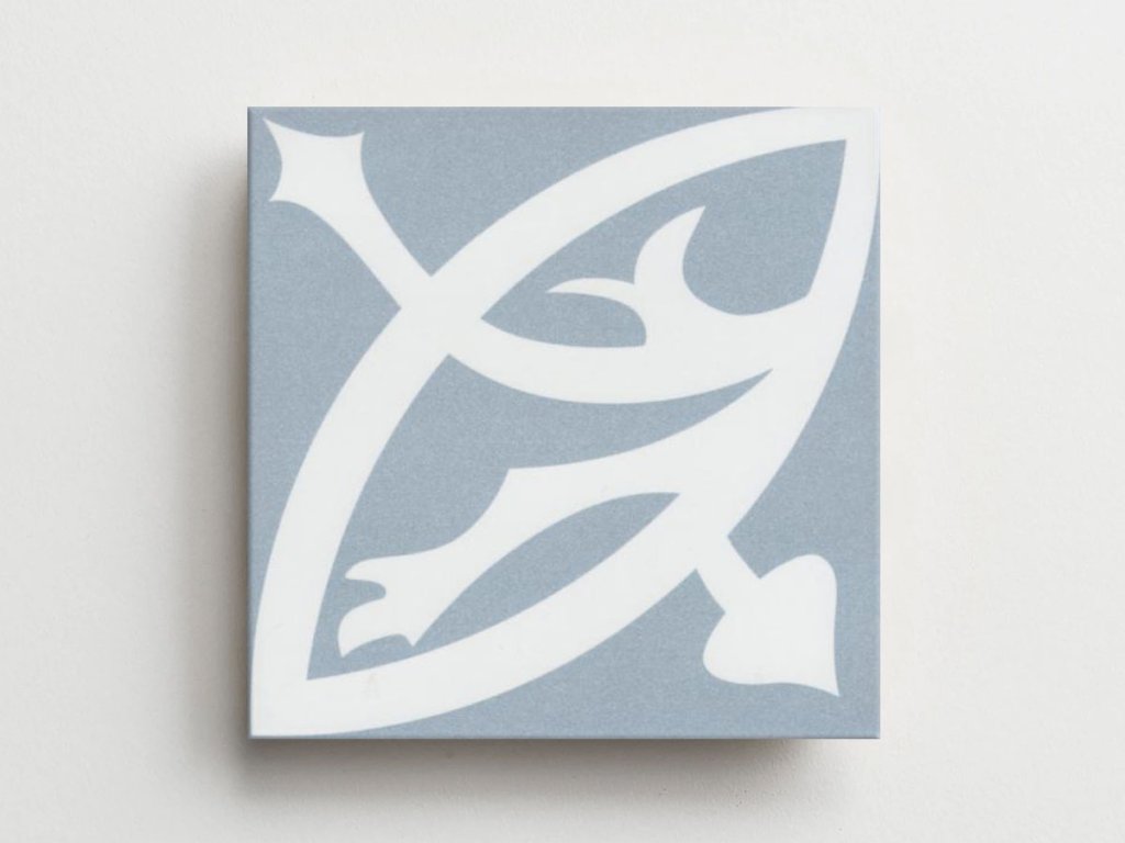 Vzorovaná čtvercová dlaždice Revoir Paris La Madeleine Zelie Bleu ve formátu 20×20 cm s matným povrchem. Na měkkém soft-blue podkladu vyniká grafický bílý ornament s elegantními křivkami a šipkovými akcenty. Vzniká vzdušná, jemně dekorativní kobercová kresba, která sluší koupelnám, kuchyním i vstupním halám. Skvěle se páruje s jednobarevnými kusy série (ivory/soft blue/grey).