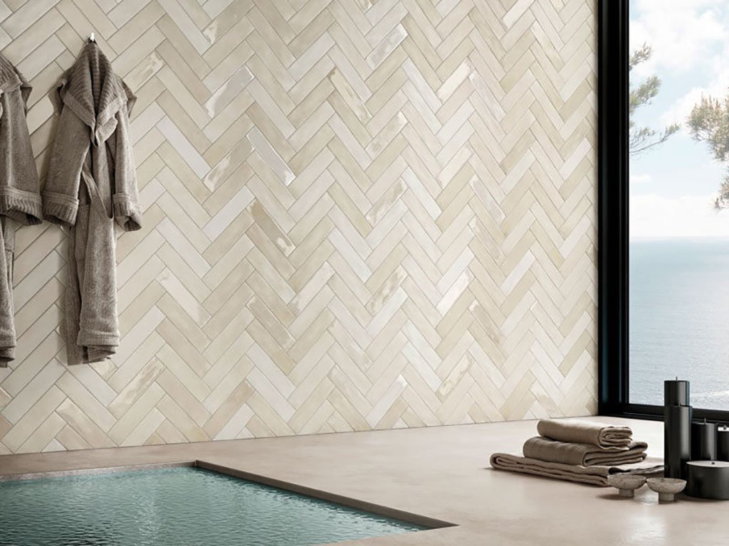 - Kladení: na výšku prostor opticky „zvýší“ (sprchy, malé koupelny); rybí kost vytvoří jemný dekor.