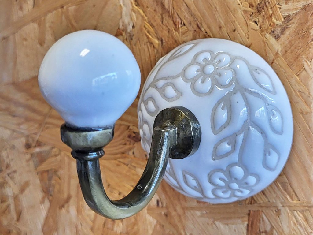 Háček retro kovový s keramickými detaily bílo šedý s kytičkami