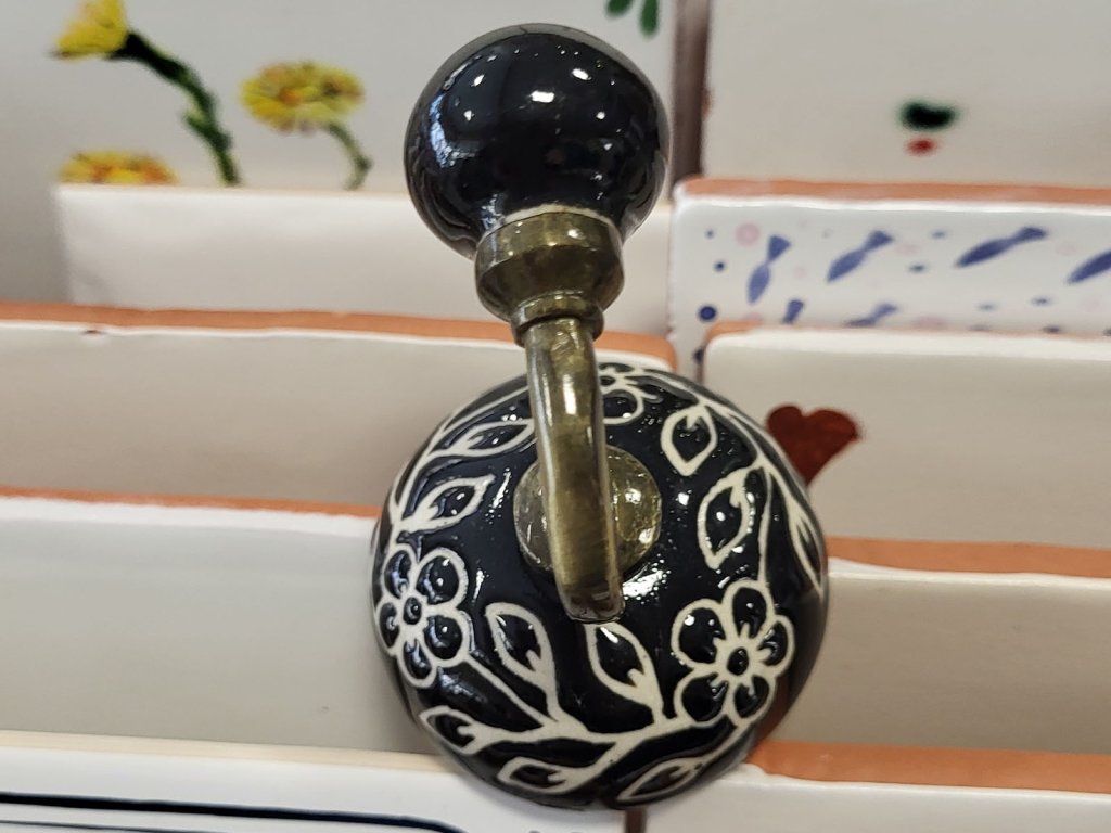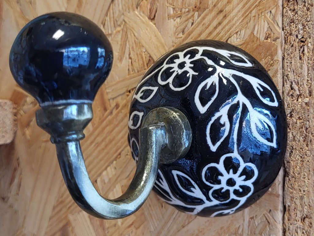 Háček retro kovový s keramickými detaily černo bílý s kytičkami