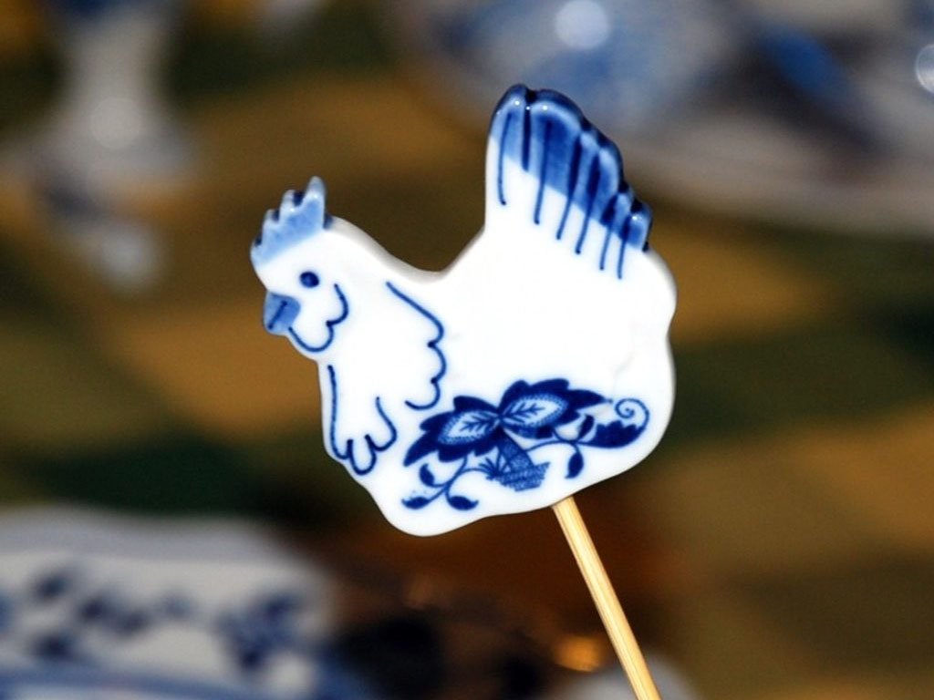 Bílý porcelánový zápich, slepička, zdobený modrým dekorem Cibulák umístěný za špejli k zapíchnutí do květináče, truhlíku, kamkoli, kde Vám bude dělat radost.